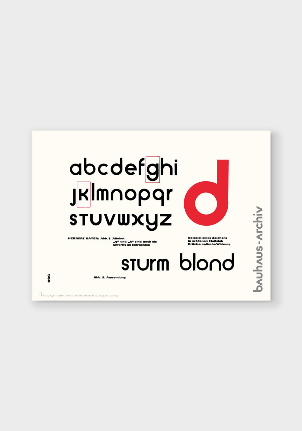 g와 k라는 두 문자가 미완성으로 설명되어 있습니다. 이러한 방식으로 바이어은 디자인을 프로세스로 보이게 합니다. 유니버설 폰트는 1960년대에 바이어가 바우하우스 아카이브 베를린을 위해 디자인한 로고에 사용하였고, 동시에 바우하우스 상점에 의해 인수되었습니다.