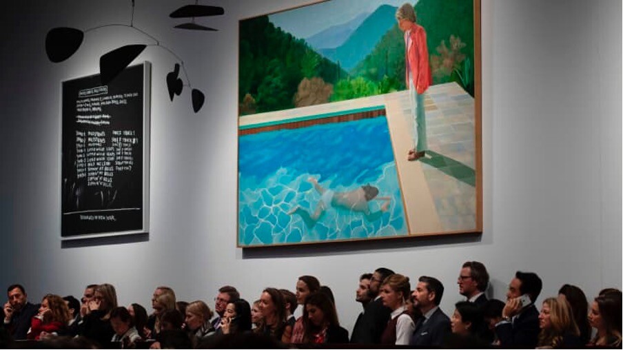 A crowd of people attend the sale where David Hockney’s Portrait of an Artist (Pool with Two Figures) is displayed at Christie’s in New York.