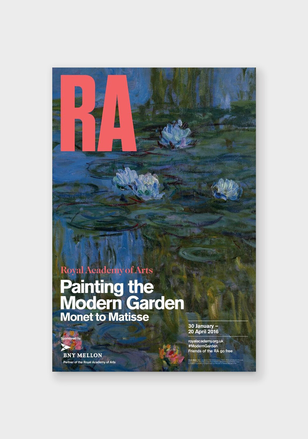 모네(Claude Monet)의 작품을 출발점으로 삼아, 이 기념비적인 전시회는 1860년대 초부터 1920년대까지 예술의 진화에서 정원이 하는 역할을 검토했습니다. 이 포스터는 오리건주 포틀랜드 미술관에서 대여한 클로드 모네의 1914-15년작 'Water Lilies'를 담고 있습니다.